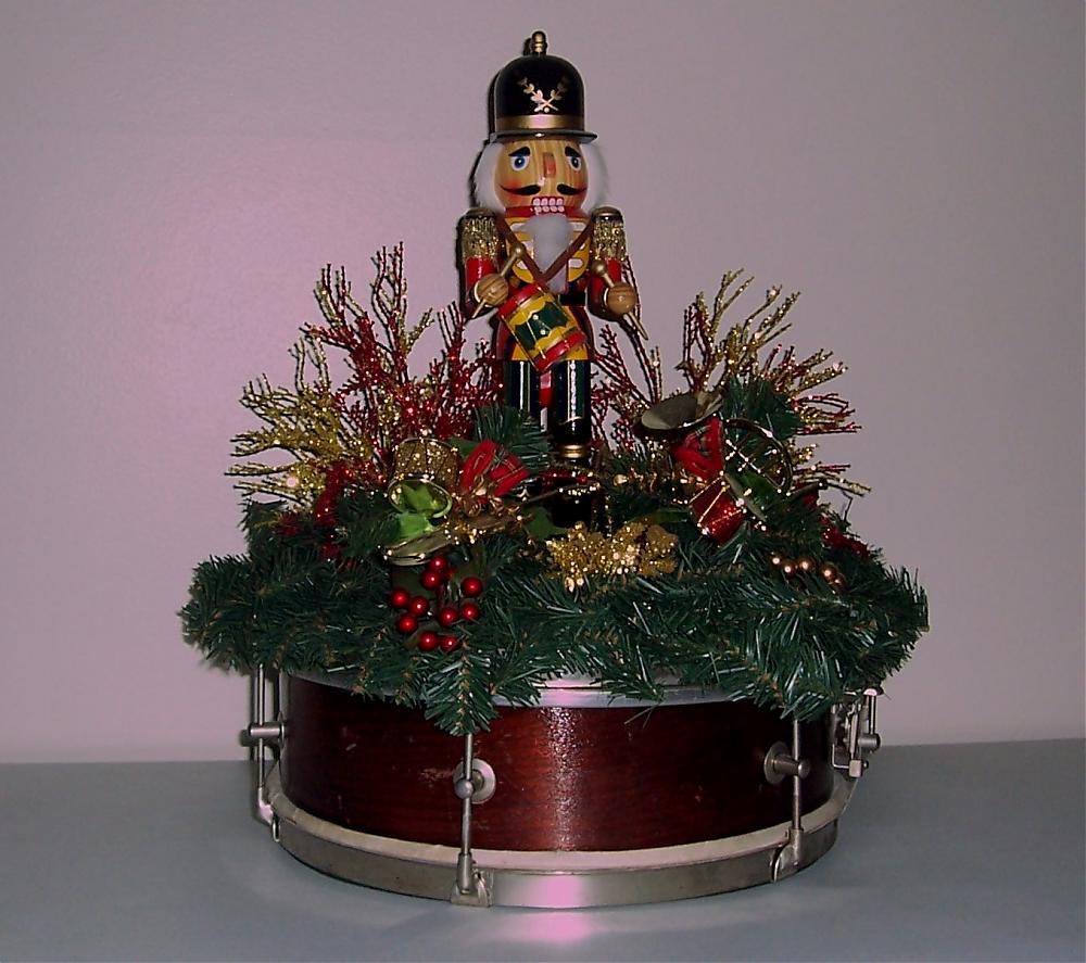 I happened to have an old wooden Kent snare drum with a busted out batter side head that I used as the base for the piece. I then added a parade drummer nutcracker as the focal point , surrounded by a pair of marching drums (gold glitter & red glitter), a few other musical instruments and the usual array of Christmas "stuff." I normally display this one in my music room during the holidays.