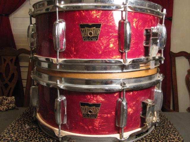 I have a drummer friend of mine. I was showing him my drums and talking about ebay and he asked me to keep my eye out for some red pearl majestics. I found a snare 1st, then I found a 5 piece kit. both snares have identical heads top and bottom and everything else is identical, except the dampener. The dampener knob on one has this big wing nut lookin thing between the knob and shell, enabling you to engauge the dampener fully with one twist on 2 fingers. The other dont have the wing thing, but looks like it is supposed to. Very cool design actually. The lugs look like slingy's. All these really need is a dang good cleanin and some heads.