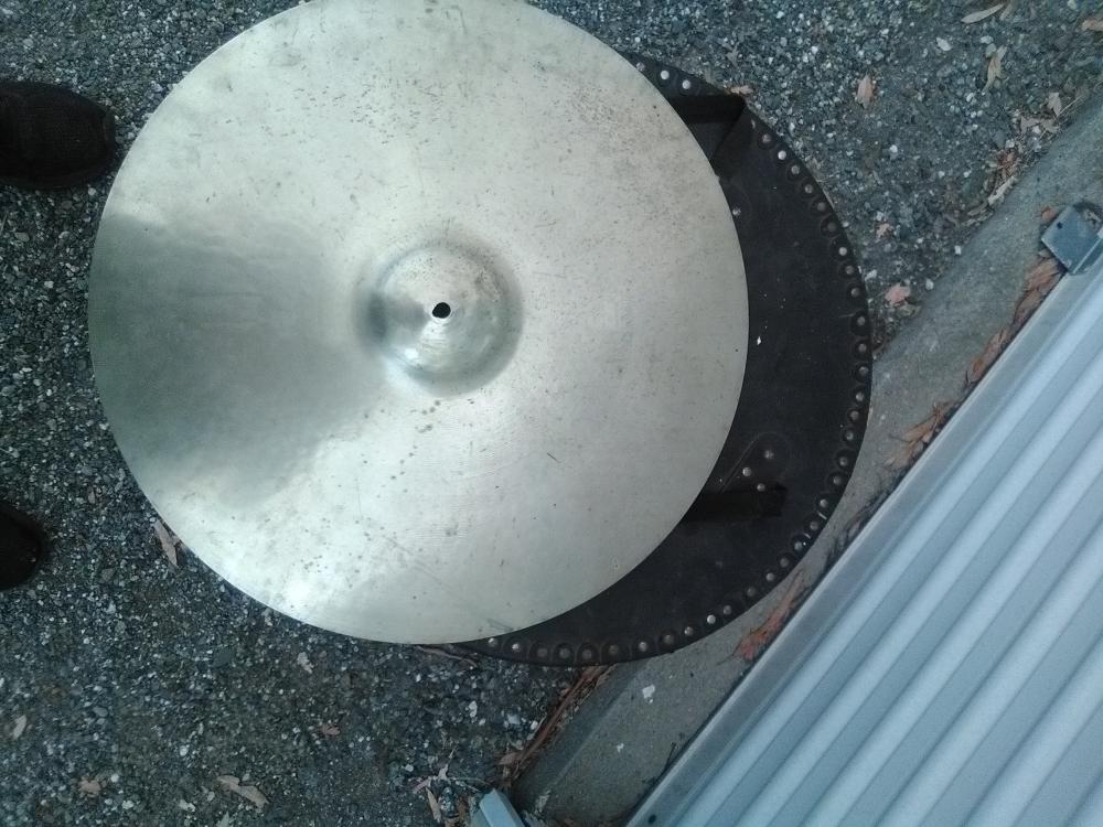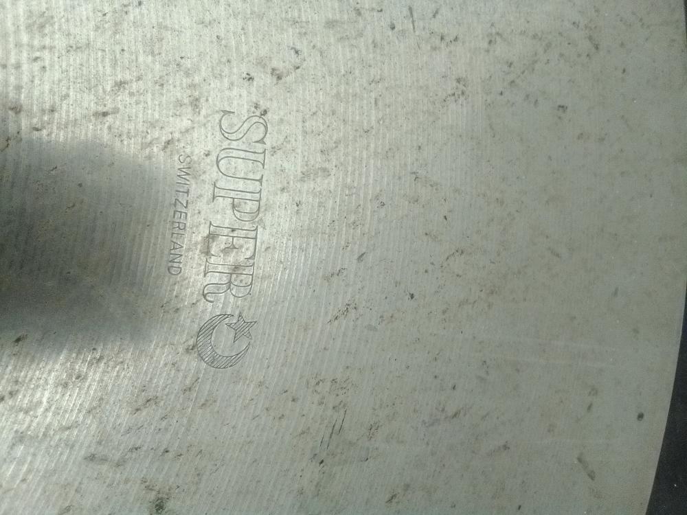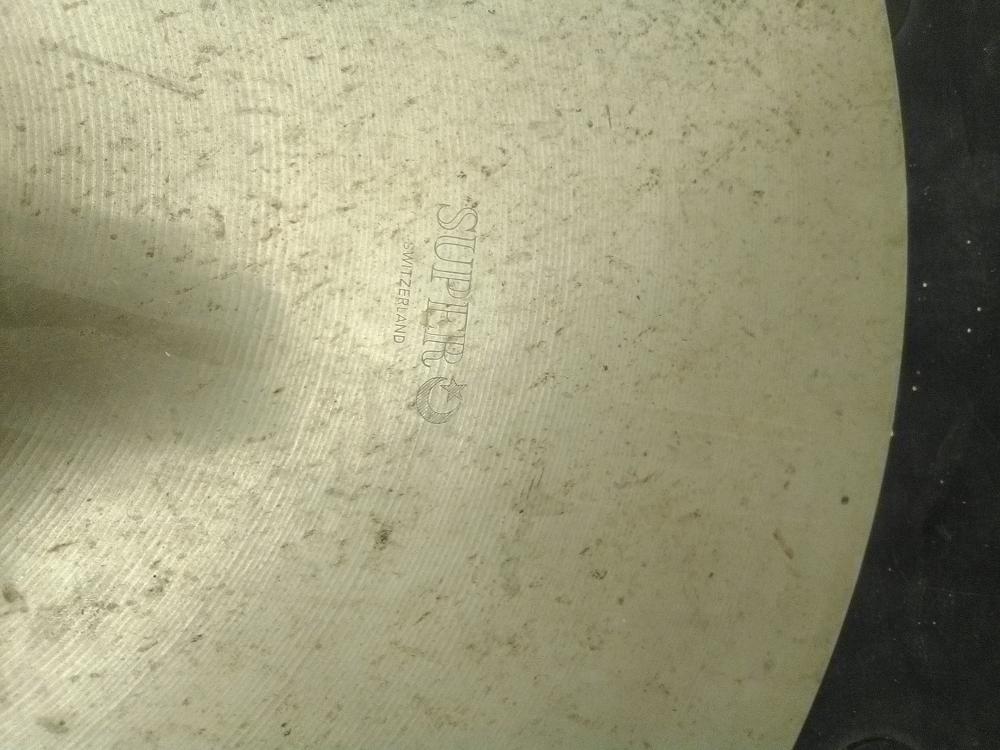 This is the cymbal that came with the load of drums last week. The name is Super with a half Moon shape then Switzerland.