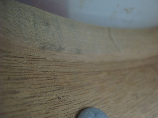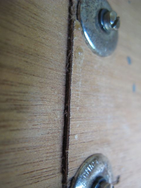 Its near impossible to see the ply or plys on the edges due to the old stain finish that overlapped. If you look down the edge a bit you can see what appears to be the start of the ply tapering out...