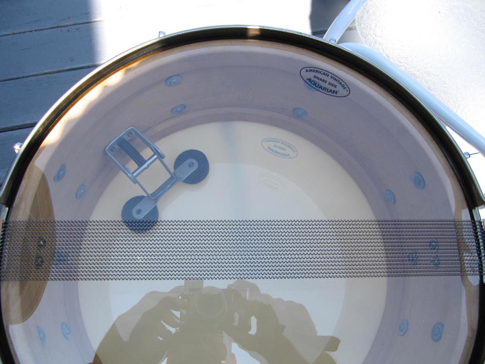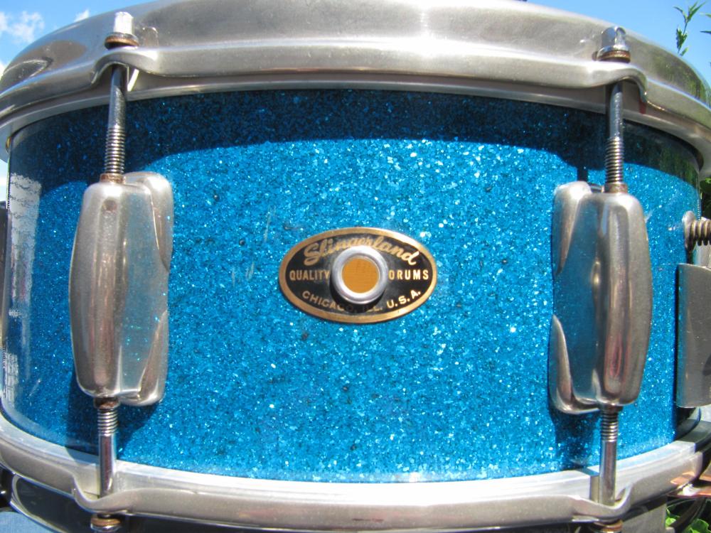 This is a beautiful early example of the Radio King Super Krupa Solid Maple Snare, 5.5x14, Blue Sparkle. 1st Chicago black/gold badge. Shell is in excellent condition, with only minuscule re-ring separation (see photos). Wrap is shiny, minimal darkening, nothing but a few very minor surface scratches (see photos). Nickel hardware has a beautiful satin sheen that does not come through in the photos. Clamshell has the original arm and correct early butt-side tuning knob. Clammy is undamaged and works properly. The CoB sticksavers are the early, heavy Sound King hoops. Tone control knob is nickel. Tension rods are period correct, are more highly polished than the other hardware and may be chrome plated - I simply cannot tell. Puresound vintage wires are present. The drum comes with 2 new Aquarian vintage heads. Remo heads fit fine. This is a beautiful drum that present even better in person than it does in the photos. $399 + shipping.