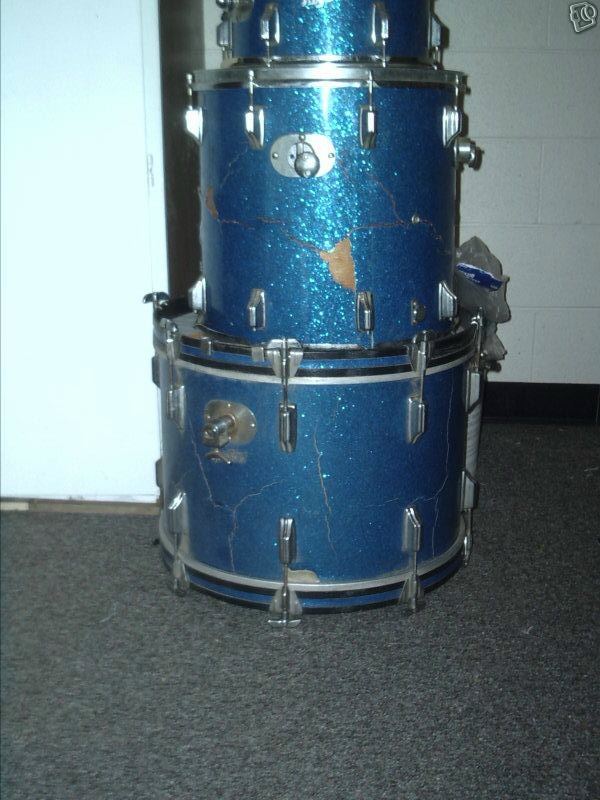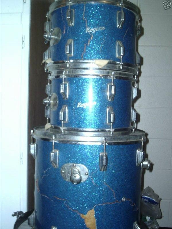 I purchased this Rogers Londoner kit some years back. Got it for cheap, due to the bad cracking of the wrap and even some missing pieces. I didn't feel very bad doing a complete re-wrap, since it wasn't a rare finish!-Mark