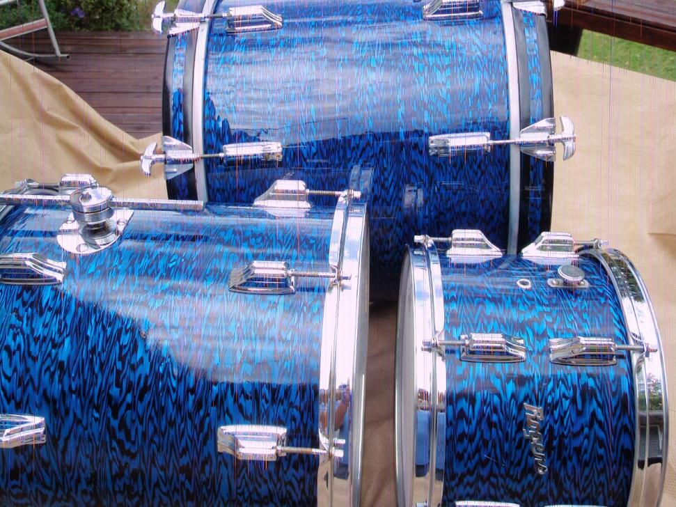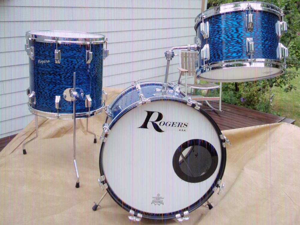 Blue Onyx Rogers Bop Set. Orphan drums, not born together. 12" tom, 14" floor tom, 18" bass converted from floor tom. You can see from the pictures that the new wrap very closely matches the vintage wrap.