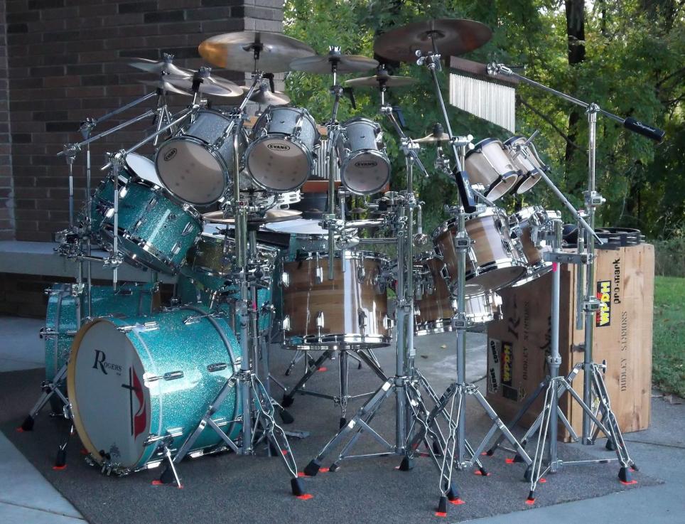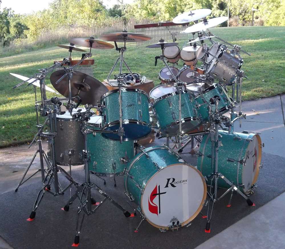 Since I wanted to use a non-Rogers broken glass color (turquoise broken glass), I used orphan Rogers drums (Dayton and Fullerton shells) which had their pearl covering cracked, split or damaged. The silver glass FT is all original Rogers. With this setup I use a wood DW snare in ginger broken glass. Stands are a combination of Rogers supreme cymbal & snare & hi-hat stands plus five DW 9000 series 9799 stands for the cymbals & the 8X12 & 9X13 toms. There are also two Slingerland 80's magnum boom stands on the hi-hat side, the counter weights have the Slingerland name on them. All cymbals are Zildjians which I rotate from my stock of cymbals. Two pair of wind chimes (rock and jazz), depending on the type of music and desired projection. LP Cowbells, triangle, tambourines, and finger cymbals (attached to a piece of wood above the hi-hat & ching ring) nestled here and there on stands with accessory clamps. Maracas, brushes, extra sticks, more tambourines and shaker eggs within reach on my wood cases behind. BD pedals either Rogers swivomatic or DW 5000 turbo.