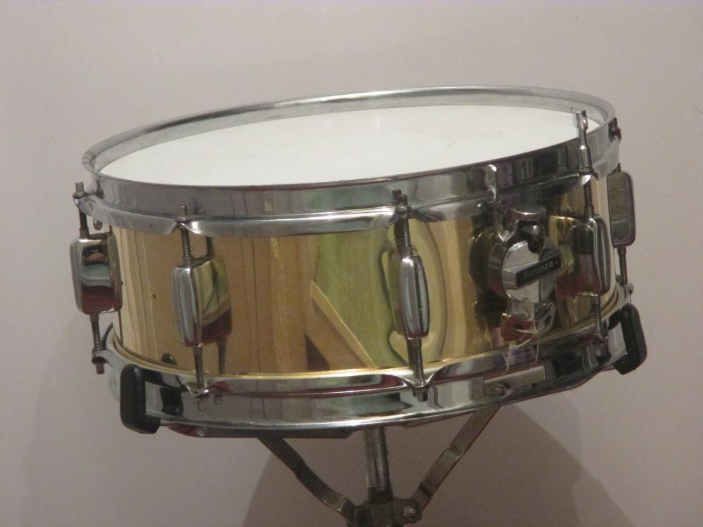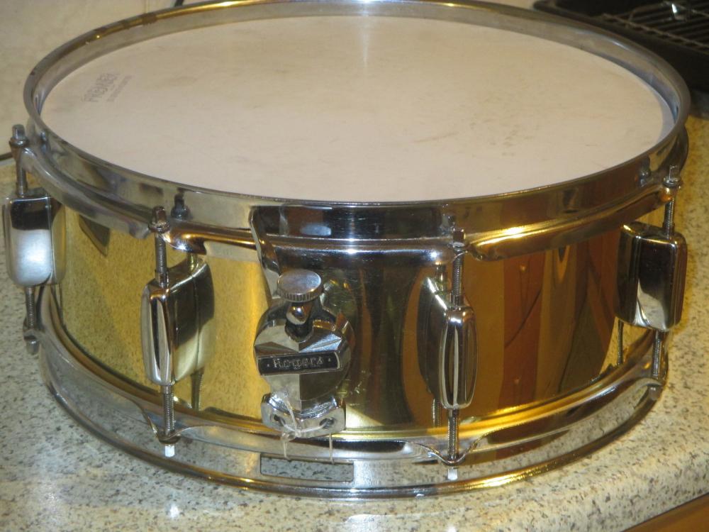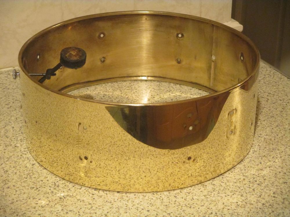 Here's a drum I picked up a while back. The shell had a lot of tarnish on it when it came to me, but I polished it up to reveal the brass shell. It was a lot of elbow grease, but worth it in the end.