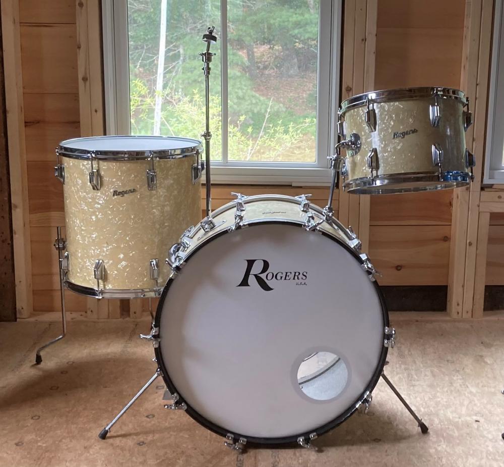 An early 70's Rogers Starlighter. May have even been built when they were known as the Roy Burns Starlighter. WMP 22, 13, 16. Deep fade in the pearl, but still with lots of power. All paper tags gone so I'm guessing at around '71 with the star washers inside, etc.. I don't see a lot of signs of it being 9/72, but not sure. It does have cast collet noses, but those might not be original as the FT leg mounts are the earlier two-piece splined units.