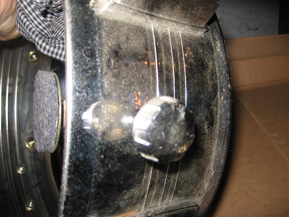 Take off the hoops and clean them first with a rag and WD-40. This removes regular dirt/dust/f*ing cat hair/etc. WD-40 can take away some rusty spots with a bit more effort, but I just give it a once over to clean the debris away so I can assess how bad the rust and crud situation on the hoop is. If there are just a few surface rust spots, a metal polish, like Mr. Metal, will take them out and the hoop will look great. If there are more substantial rust spots I will go over it will 0000 steel wool.