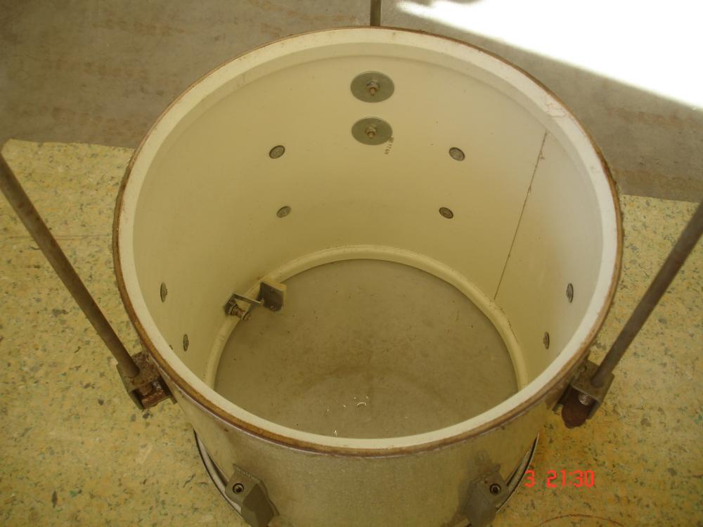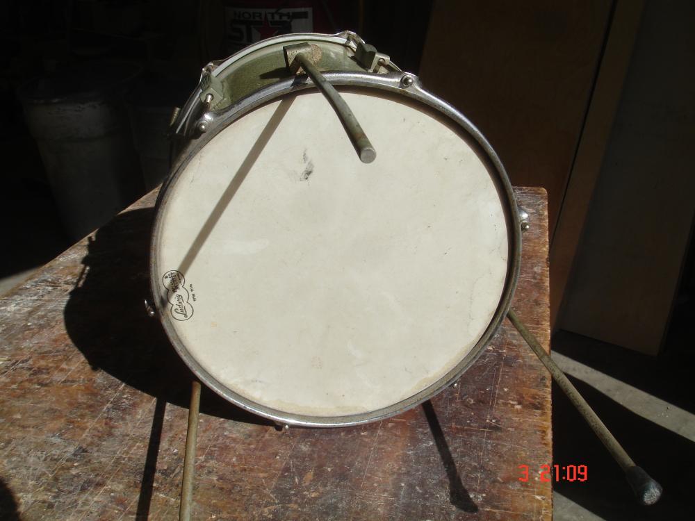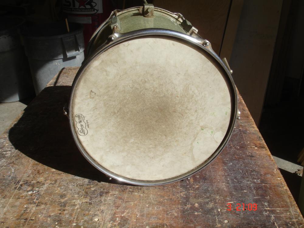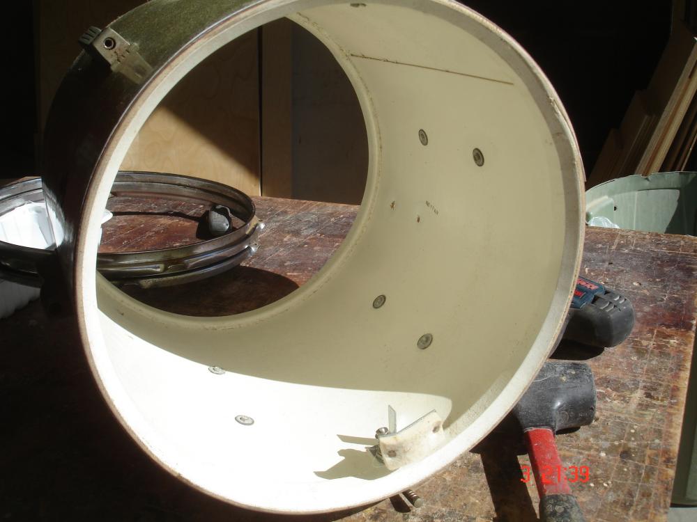 It is a 14". Heads were never removed, I had to carefully pry them from the hoops. Every nut, bolt and washer is present. The inside look brand new. What a great drum to match that white paint to! The lugs still have the original paper around the springs so Im not sure how to go about saving that. They are nickle, I think, due to the non rust but the greenish oxidation. Might just polish those without removing the springs.