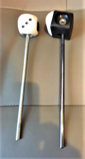 My favorite bass drum beater was given to me by my friend Bart Witrock--owner of Rockin' Robin in Houston. I don't know the manufacturer of this beater. It has a white hard plastic square beater with markings that make it look like a gambling die (from a pair of dice). The beater head pivots on a rod that makes this a self-aligning beater. The first hit on the batter head will reposition the beater head so that every hit after that will be a full-face splatt on the batter head. I have loved this little gem so much that I have looked for another one online for several years.