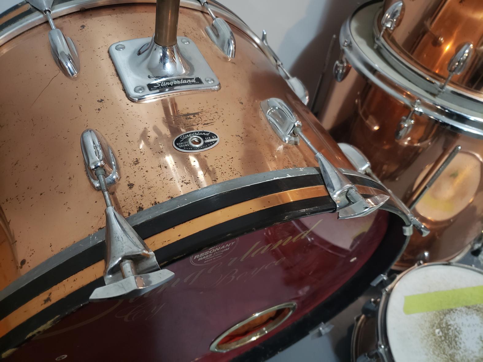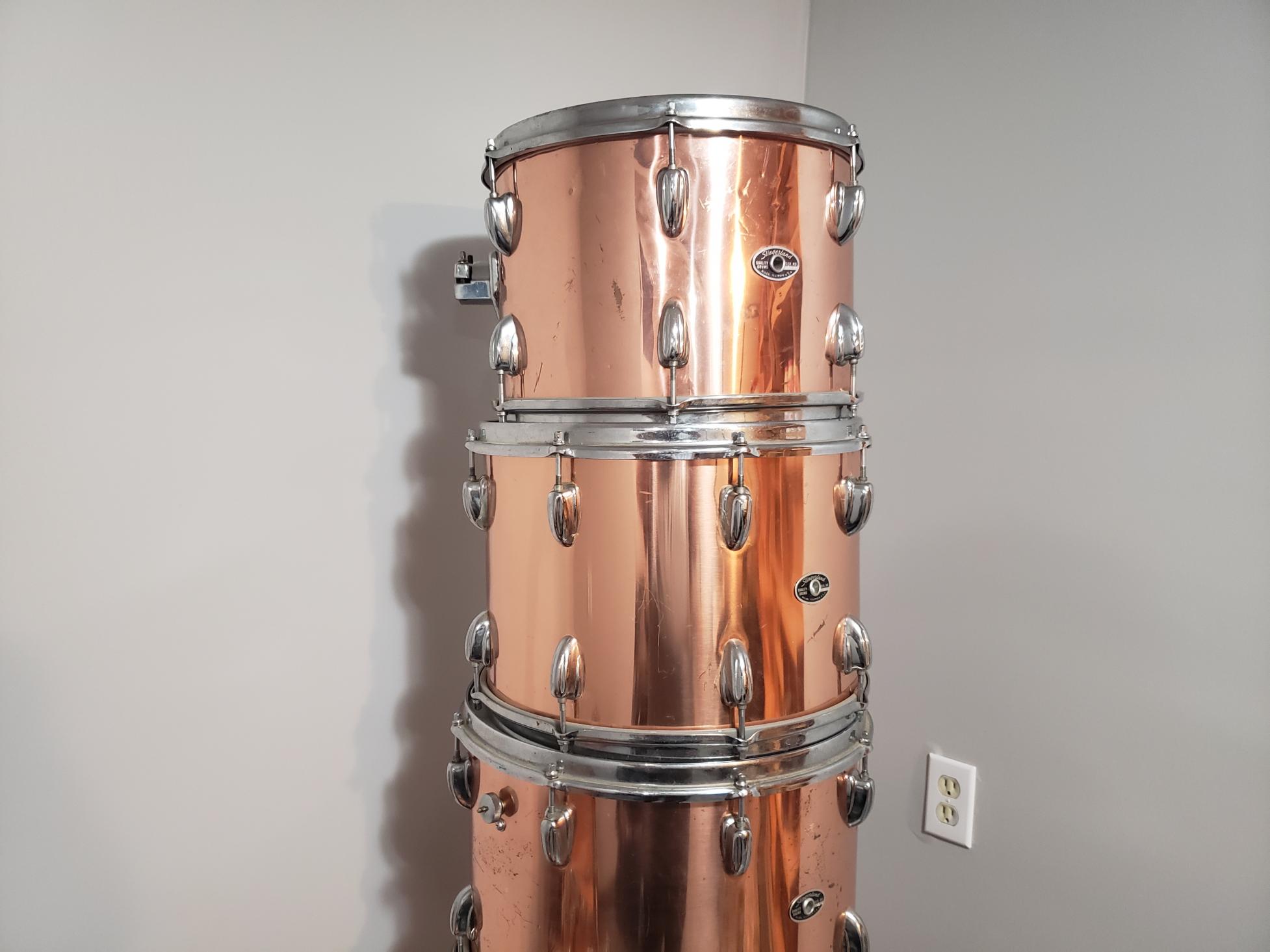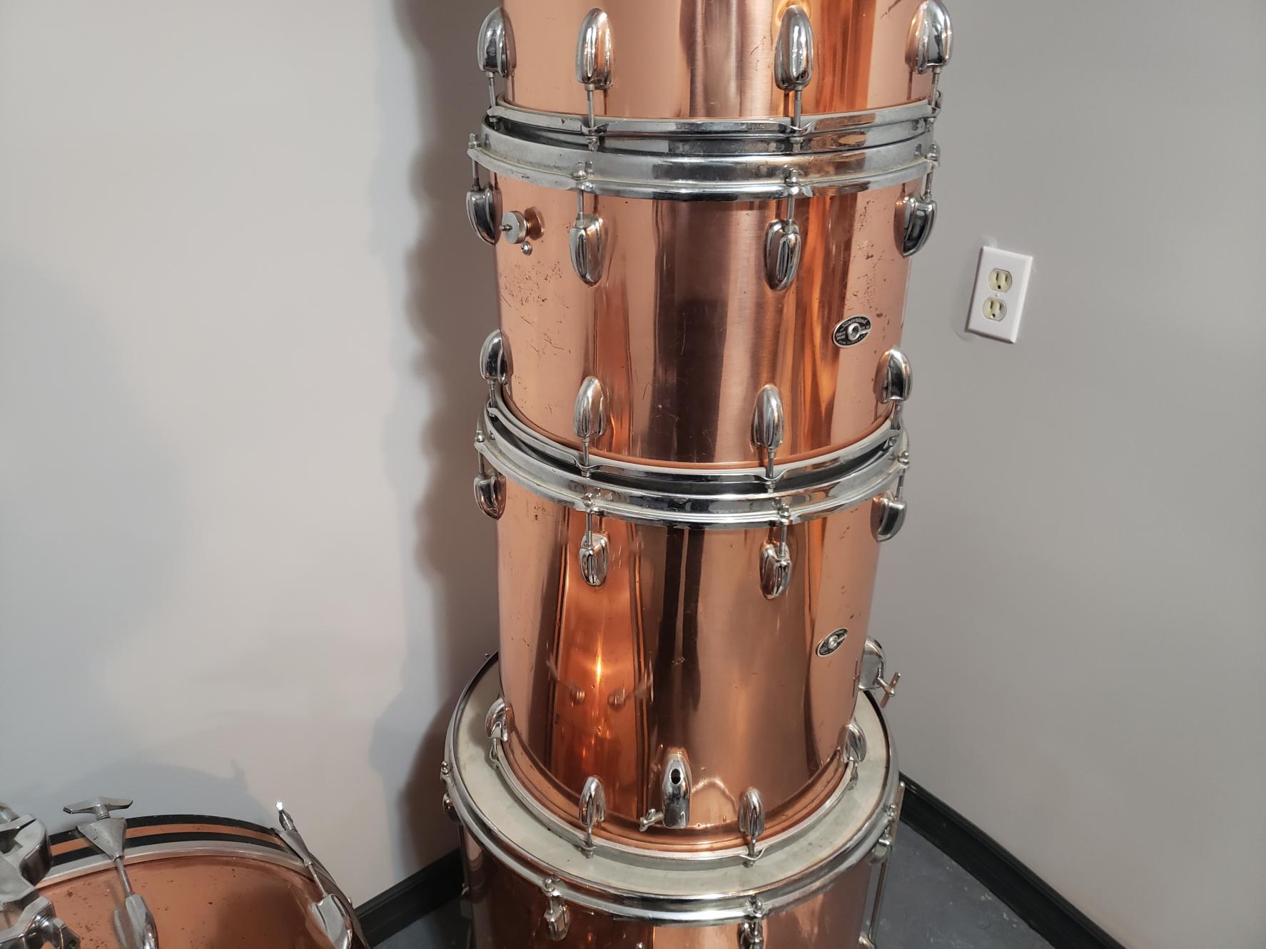 My understanding is that the tarnish appears on these copper sets because the very thin copper cladding is actually gone. I could be wrong, and a search for a definitive answer for this on VDF was fruitless (well, actually I looked at the first 230 responses of a search for “copper cleaning” and gave up before reading the next 270 responses). They are still very cool looking drums and true icons of the era.