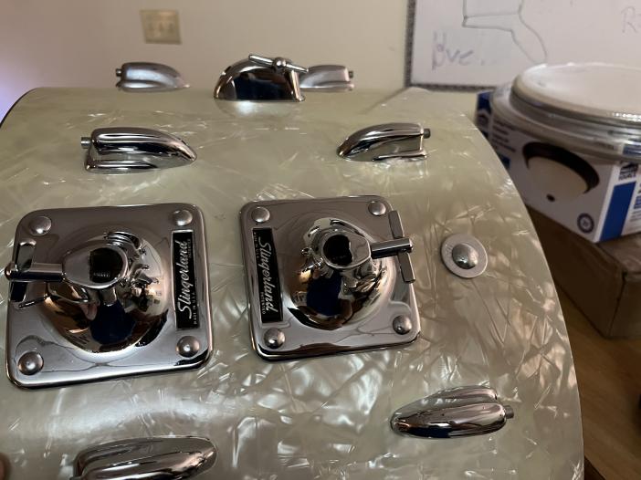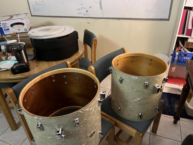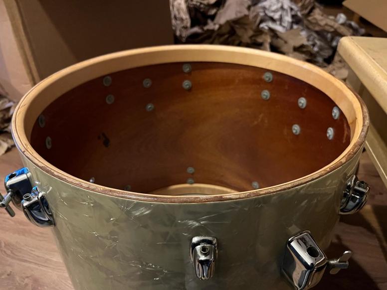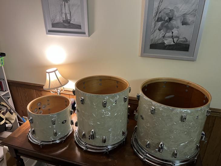 This makes the most sense to me. The serial numbers are fairly close in number. I really don’t think that there are any orphans in this kit. The yellowing/aging on the kit is all the same. I pulled off the lugs on the kick to clean it, and there has been slight yellowing of the finish, and to find an orphan that matches this would be darn-near impossible.