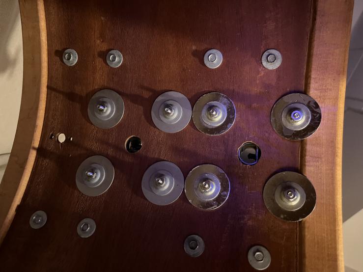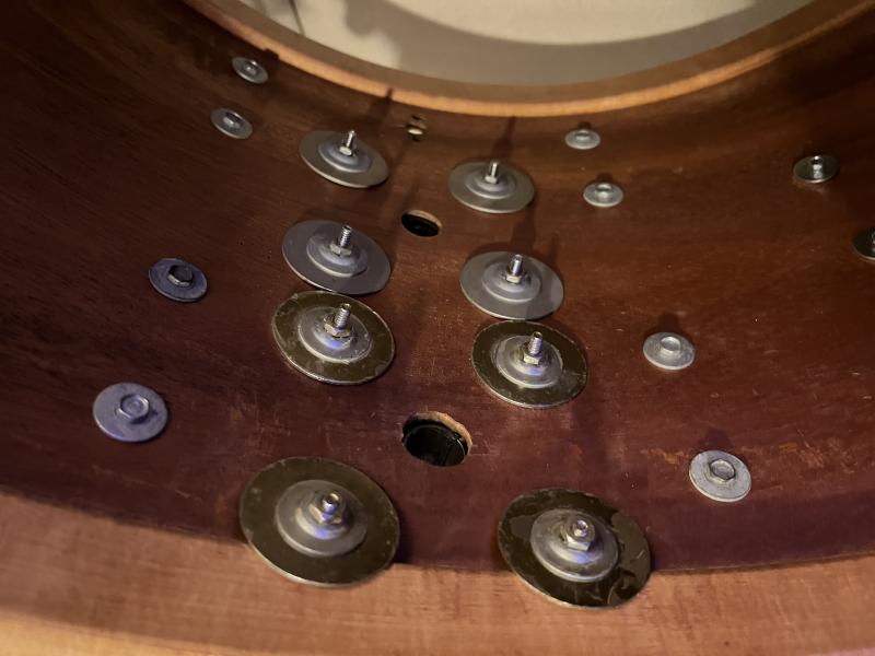 The grommets and badges on the toms look undisturbed, and I took the lugs off of the kick, and there has been some yellowing/aging of the wrap, so I’m assuming that’s all original. I’m also assuming that when the second tom holder was added that the badge was removed. You can see from the interior pic some extra holes in the shell that I covered with a carriage bolt and a wide washer. I looked under the tom bracket closest to the edge to see if the badge was under it, but it wasn’t.