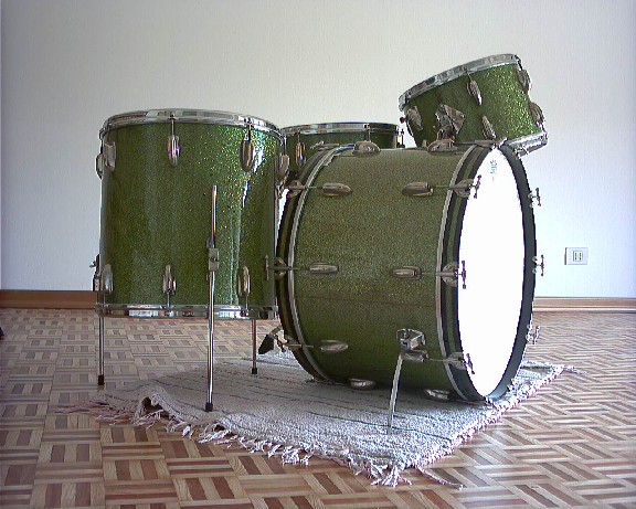 -hardware is NOB and the lugs on bassdrum, floor and ride toms all are the large bassdrum size (part #566?). The picture at bottom left of page 199 in Rob Cook's "Slingerland Book" shows a "Gene Krupa Deluxe Radio King Ensemble 1-N" with the same lugs on all drums. In the picture the snare drum is different and the rims look like Sticksavers, don't they?