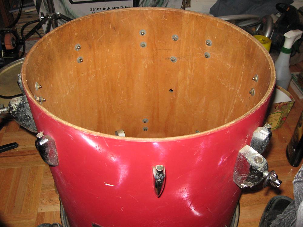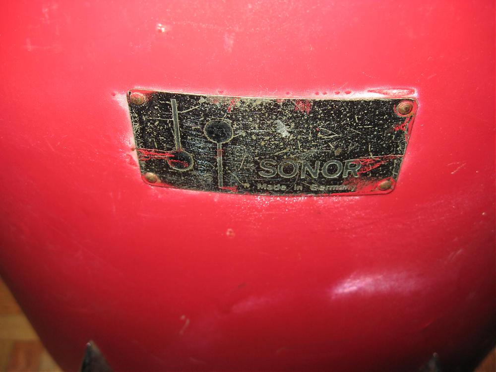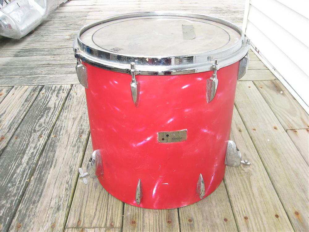 3 years ago a friend of mine was driving by some school as this floor tom was getting thrown to the trash by the custodians. He stopped and rescued it. Anyway, I just saw it the other night and he said, ya want it? So now I have it. It's a satin flame and someone painted it red. It looks like they took everything off but the badge and grommet since the red is the same under the lugs and leg mounts. I see some possible hints of white in a couple small areas. Surprisingly the satin effect still shows through a bit. So my question is how in the world can I remove the paint without destroying the wrap? I already know that Strypeeze paint & varnish remover will melt satin flame. I tried it in a small spot on an orphan drum that's in tough shape as a test during a past project. Are there any paint removers that are safe on plastics? Also, any other info on this drum based on badge, lugs, leg mounts, shell would be greatly appreciated as I'm pretty short on Sonor knowledge and would love to know. Are these the beech shells? The wood feels rock solid. I know I'll hear from Oddball and look forward to his and anyone else's answers. Thanks in advance.