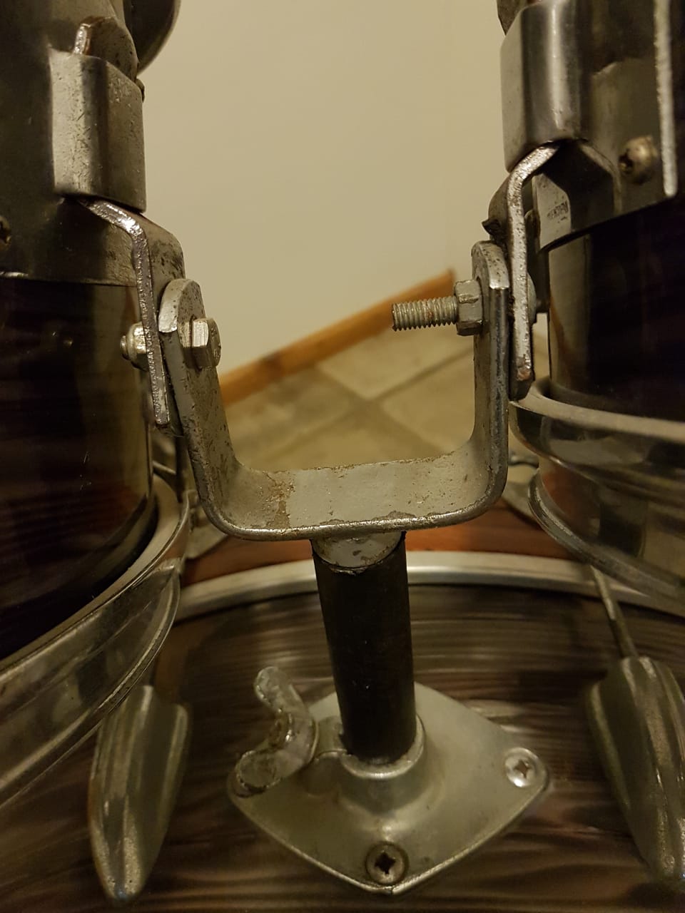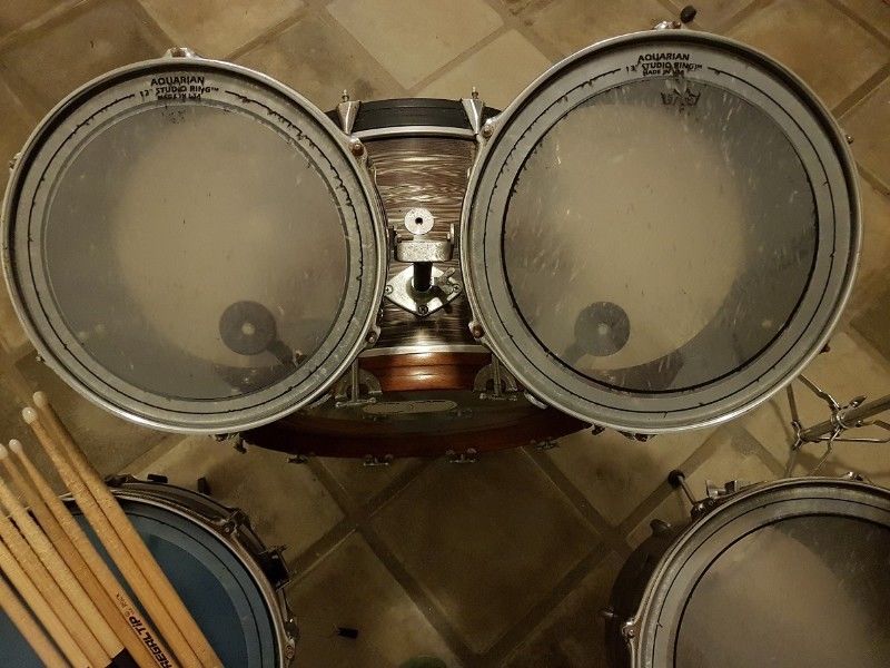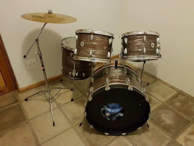 Hi there - as of late, I am rather intrigued by these drums and I can now pick up a full set 14" snare, 22" kick and 12, 13 and 16" toms along with throne, stands, sticks, a Camber ride(!!!) etc) for the equivalent of USD160. I cannot view them, they are too far away and I have an option only for today. From the pics they seem to be in reasonable condition - I think there's some typical pitting, some rusted hoops and non-original bass drum hoops, but the kit seems solid. I notice the kick is a 10 lug which is good. Here are some pics. Do you guys believe that the price is fair? What is that wrap called? Do you guys know the age of these drums based on the badge? Thanks guys, all help will be greatly appreciated.