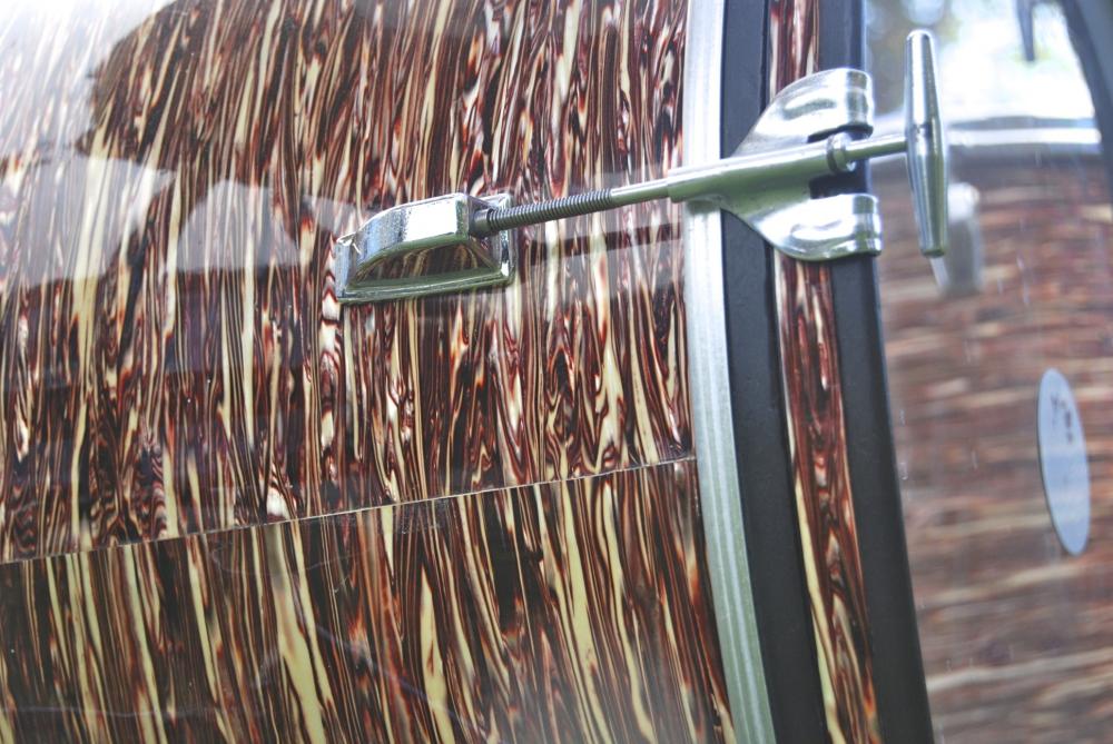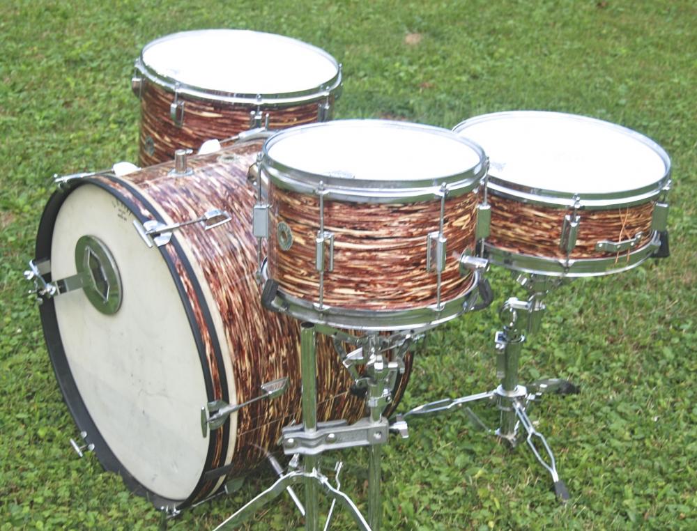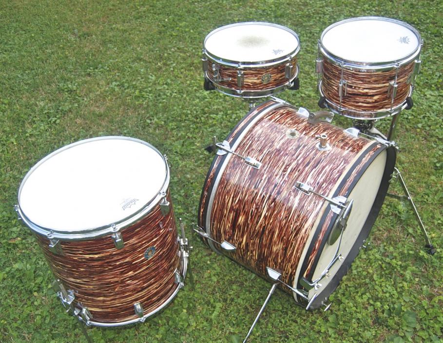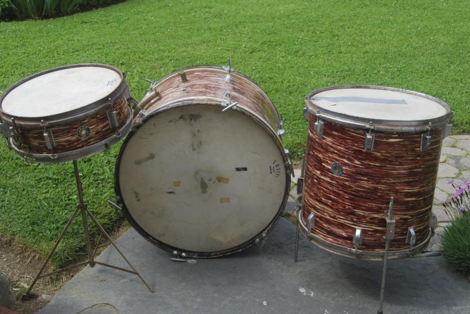 Here are my beloved Red Oyster Pearl Kent drums that I found in an attic at a Tag sale a few years back. It took me awhile to find the missing Tom on ebay , but it has the tube arm mount vrs the rail and clip style like mine would have had. Once I cleaned them up and cut some proper bearing edges they sounded great.