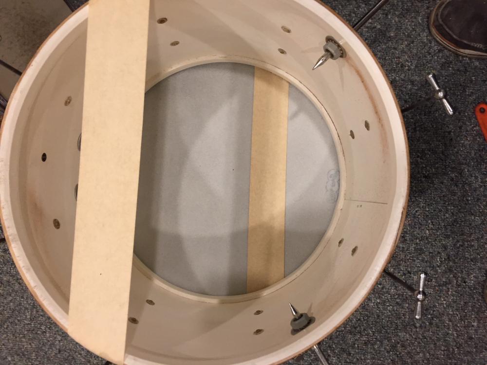 Rubber foot is missing on the floor tom. The base drum's rubber feet are cracked from age but intact.