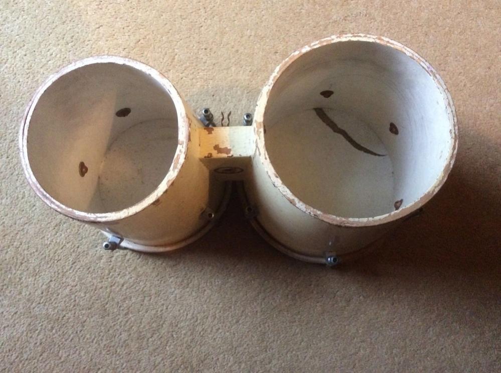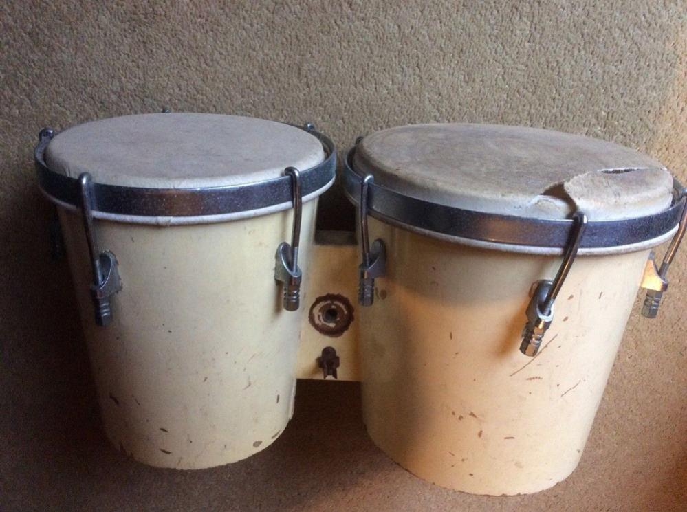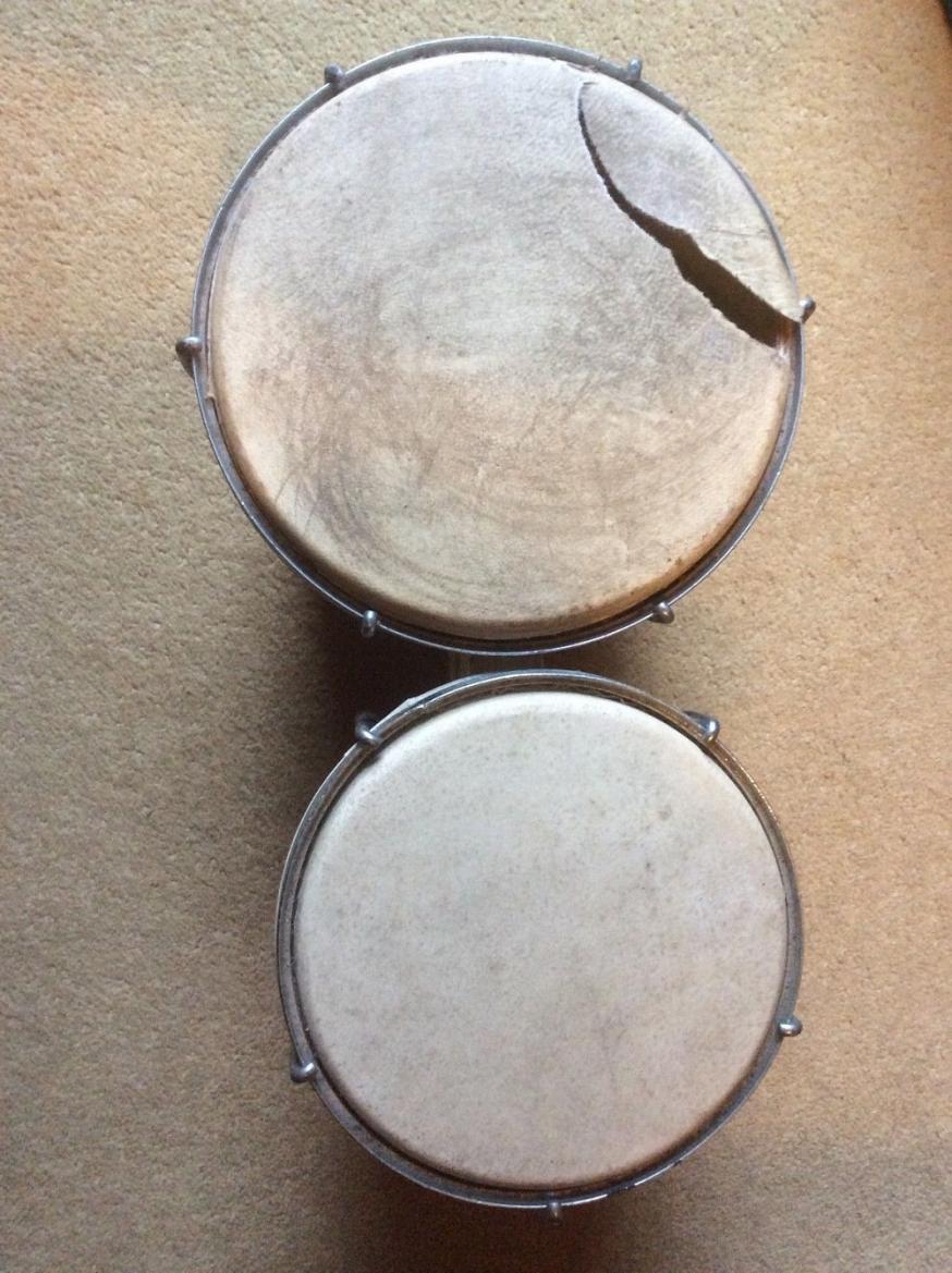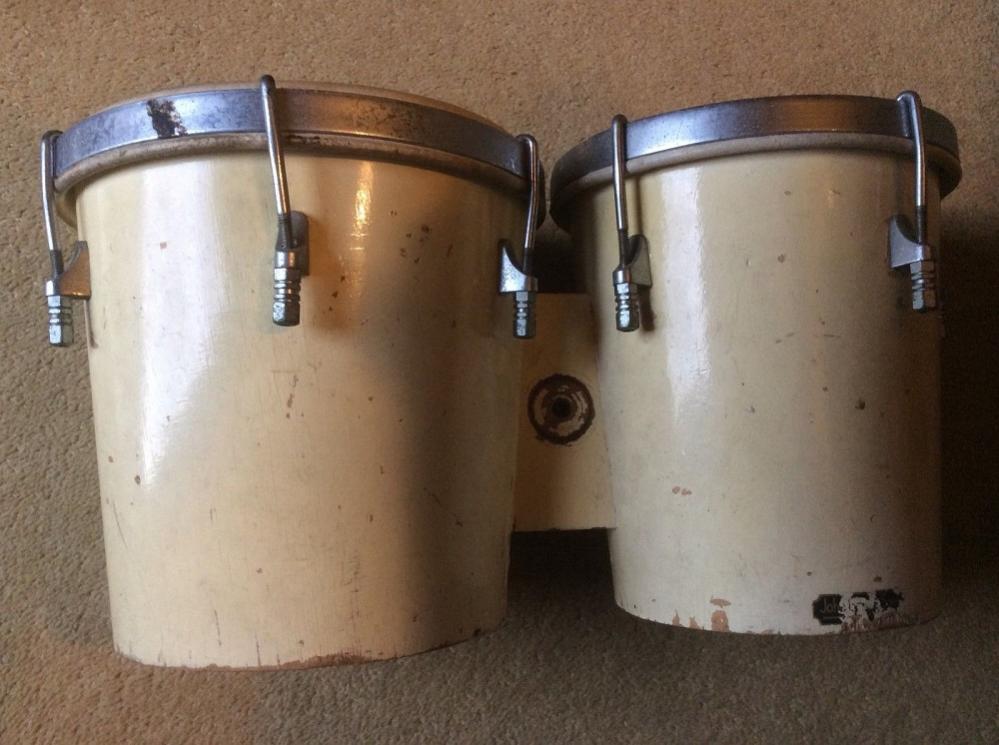 I bought these bongos from a boot sale for £1.00GBP. The guy wanted a tenner and i told him the bongos are worthless especially with a broken skin. He knew no different so he said give us a quid as a gesture. These bongos are rare these days Made in England and named after the famous Edmundo Ros. These were made by John Grey 50'S/60'S. I wrap all my own drum heads with calf skin so wrapping these no probs. Ive been making my own drum heads for the past 20 yrs. What i do need if anyone has one is the John Grey tuning key for these.