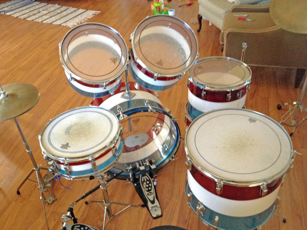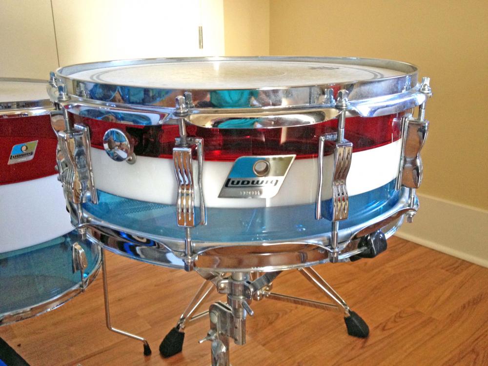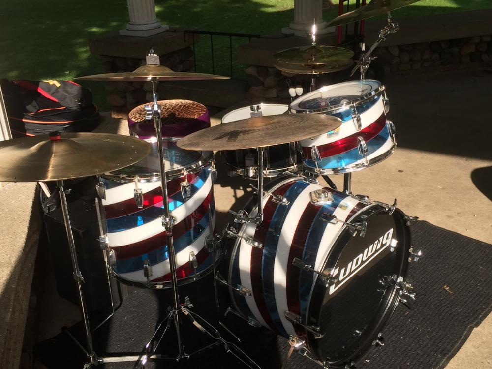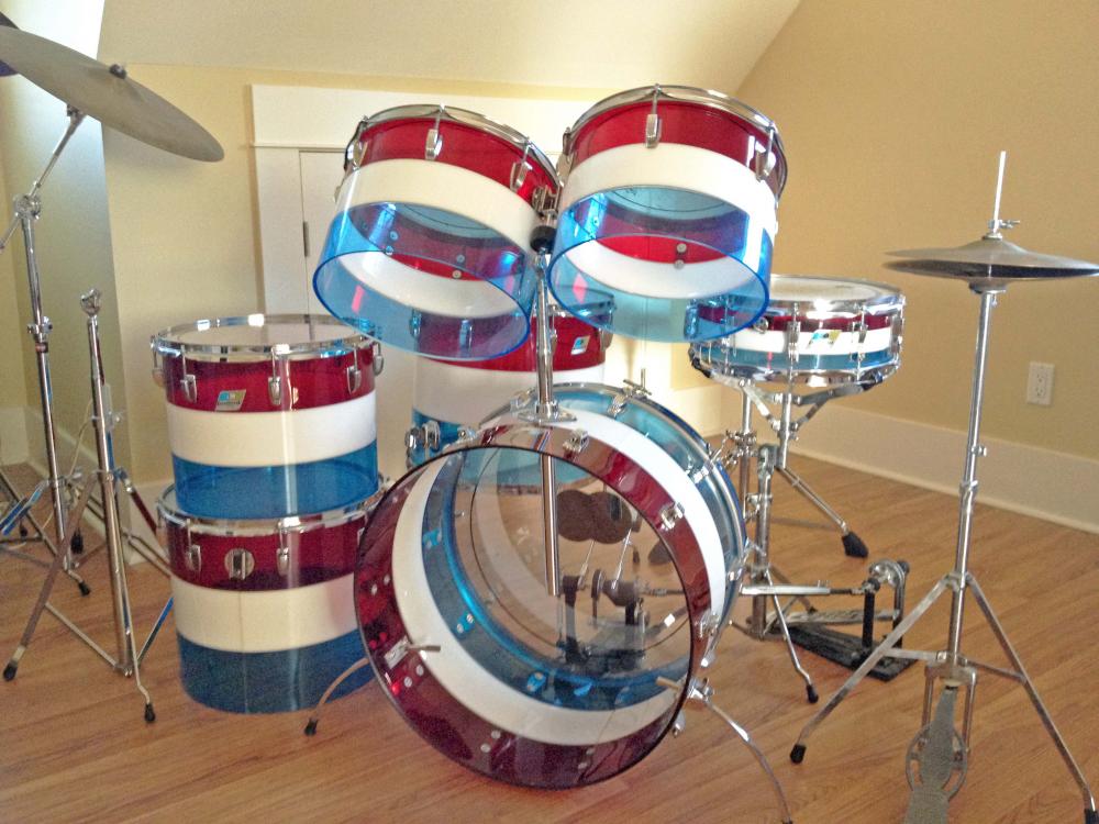 Need some help identifying my kit from the Seventies. According to the research, I have a Ludwig "Rainbow" Vistalite Pattern "A" (Red, White, Blue) in the Quadra-Plus configuration (with concert-toms and original snare/stand). I have heard the names "Spirit of America", (Bi-Centennial) and "Barber Pole Vistalites" being used during my research if that rings a bell.