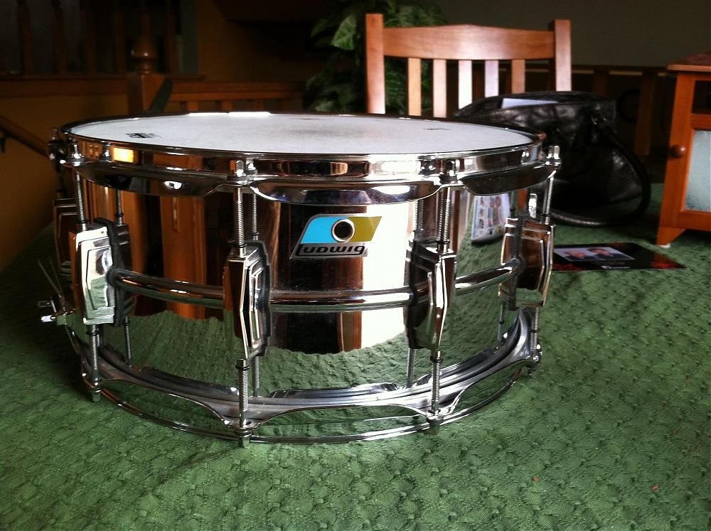 I don't think I looked at the drum in 2 years, I've had it for 10, never really played it, I'm more a Slingy guy. Sits residing in a Box wrapped in Plastic. Both original, and Puresound Snares, which really make this drum sound totally Bonham. Both original Ludwig Heads (not played), and it has new Remo Ambassadors top and bottom.