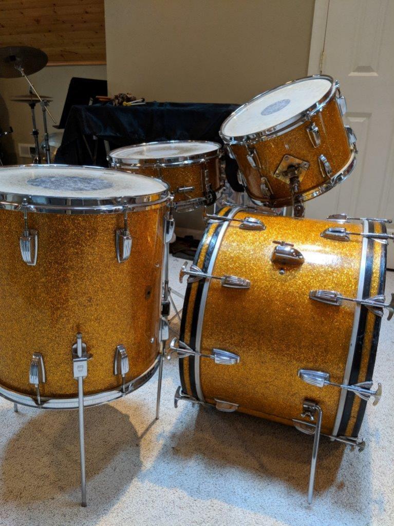 In the case of the drum set in question I bet if you take a close look at the WFL badges they will say "Ludwig Drum Co." on the bottom. The factory certainly would not have any qualms about shipping out a set with mixed badges at the time of the transition. Also 13/16/22 is perhaps the most common combination of drum sizes in the history of drum sets so no mystery there.